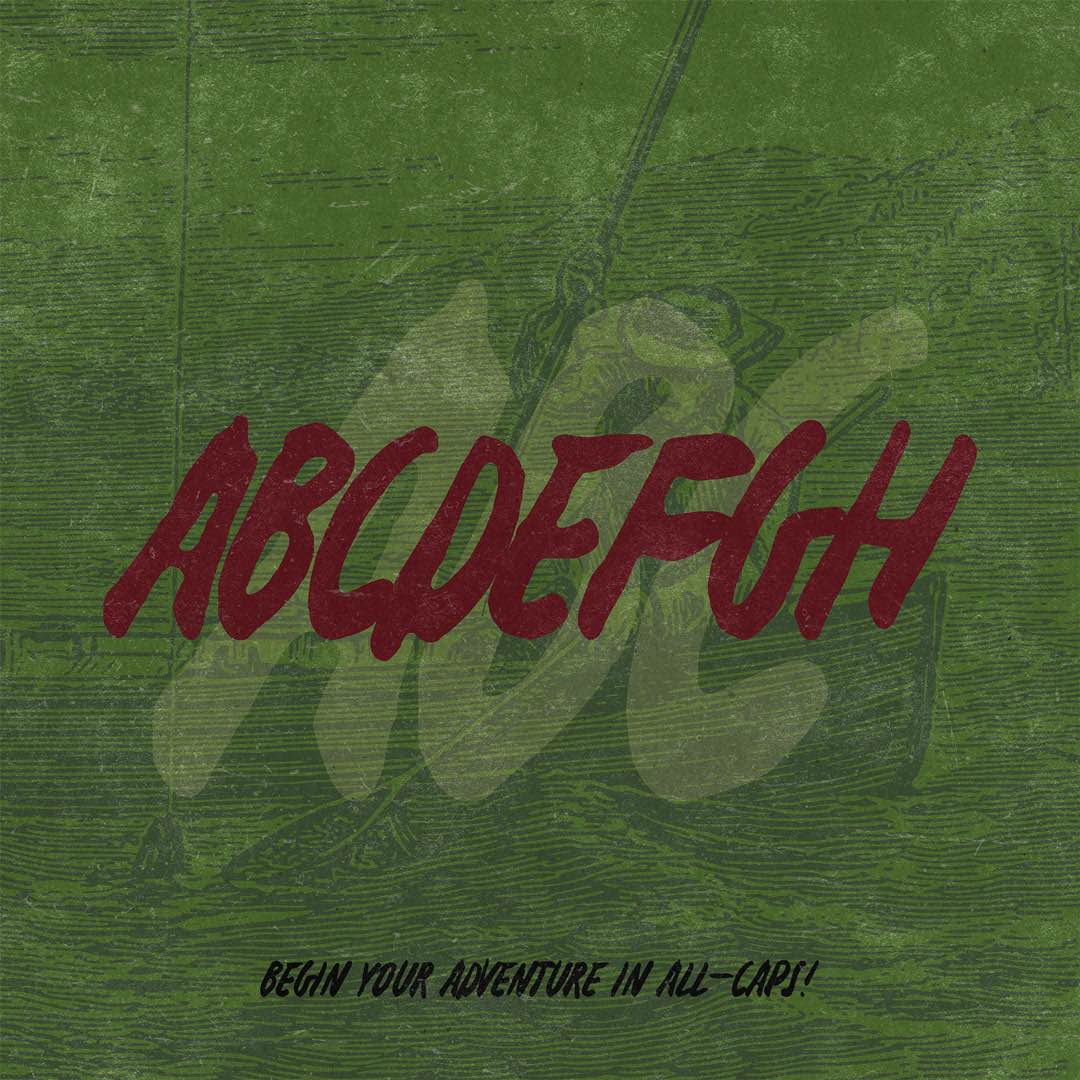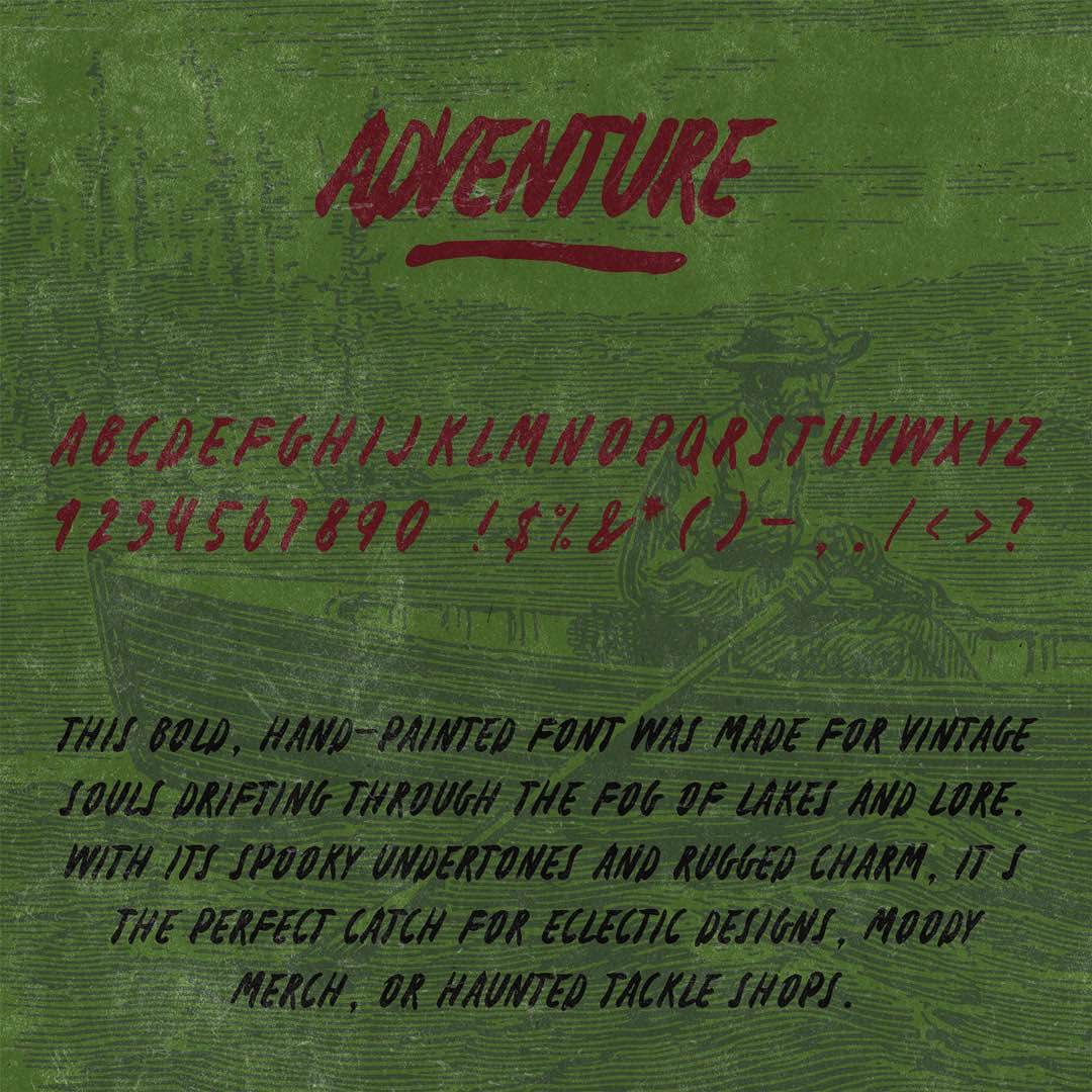Adventure is a bold, hand-painted typeface crafted for the wild at heart. With thick brushstrokes and an eerie edge, this font captures the spirit of foggy lakes, haunted cabins, and vintage tackle boxes. Its raw, gritty texture lends itself to everything from horror posters to retro-inspired logos, apparel, and outdoor gear. Whether you’re designing for the great unknown or something a little more supernatural, Adventure brings just the right amount of chaos.